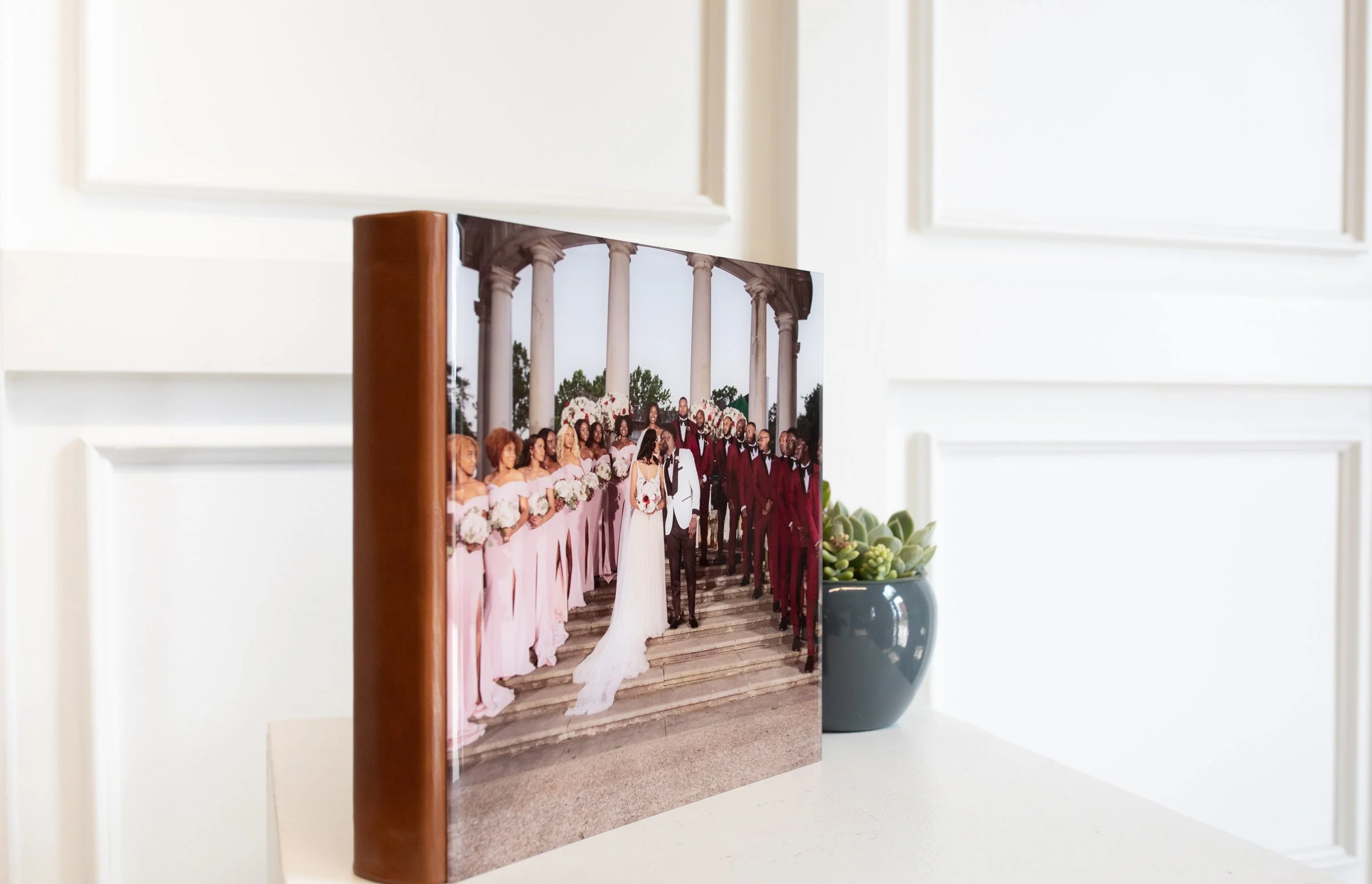 Fine art museum quality printing. genuine leather back cover with a beautiful acrylic cover of your favorite wedding portrait